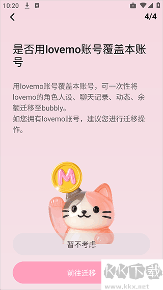 3、用lovemo賬號(hào)覆蓋本賬號(hào),可一次性將lovemo的角色人設(shè)、聊天記錄、動(dòng)態(tài)、余額轉(zhuǎn)移至bubbly,同時(shí)bubbly內(nèi)的現(xiàn)有的角色人設(shè)、聊天記錄、動(dòng)態(tài)、余額將清空。該操作僅可進(jìn)行一次,且不可撤銷。