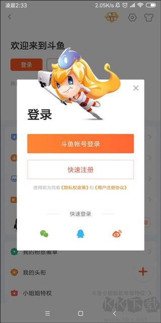 1、運(yùn)行斗魚(yú)直播,使用微信、微博、QQ,手機(jī)號(hào)等方式注冊(cè)登入。