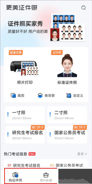 1、打開更美證件照app,有拍證件照、照片處理和我的版塊;