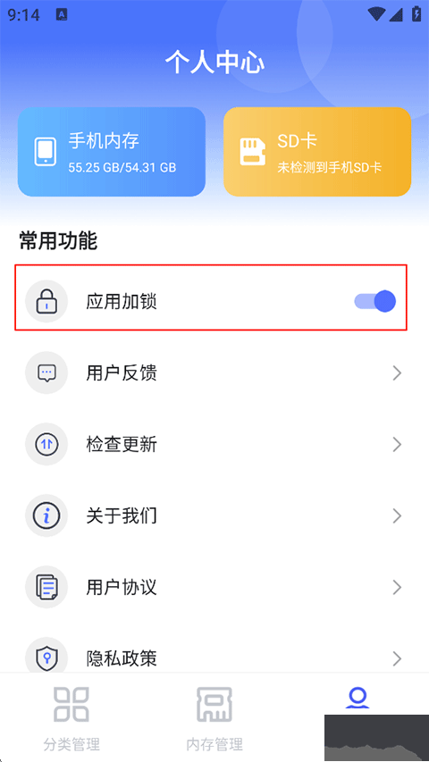 5、最后還可以在【分類管理】頁或【個人中心】頁對文件管理專家進行上鎖,開啟后前往設(shè)置密碼密保;