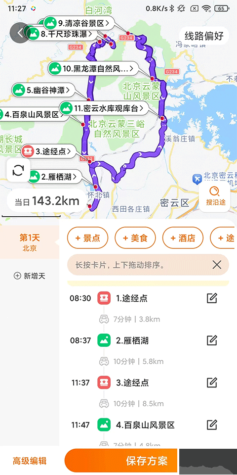 5、新增天數(shù)、編輯途經(jīng)點、拖動排序位置等,完成后點擊保存方案;