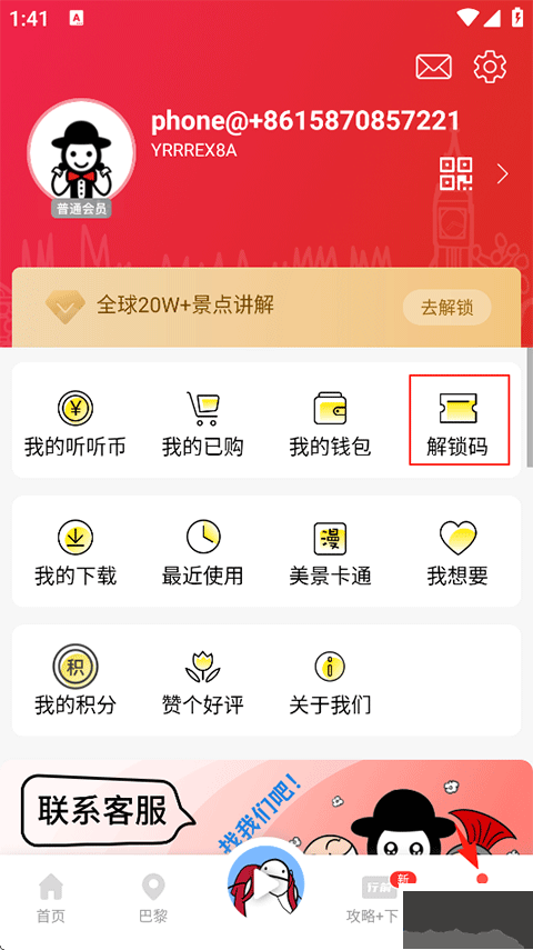 1、復制郵件內(nèi)的解鎖碼或訂單詳情的券號,打開“美景聽聽”,點擊“我的”再點擊“解鎖碼”;
