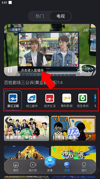 2、接著選擇我們想要回放的節(jié)目所在的電視臺,并點擊上方窗口,然后點擊進入直播間選項