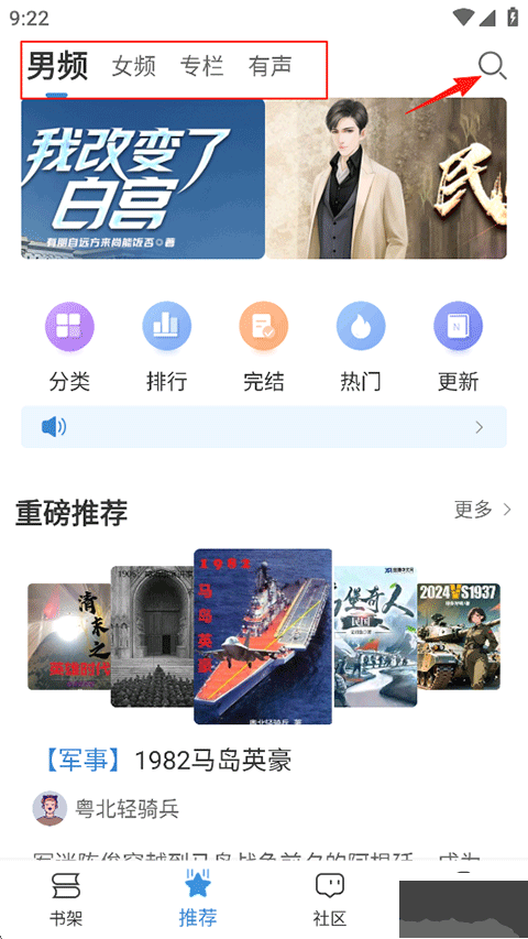 1、打開息壤閱讀APP,在推薦頁面可以依照分類篩選或搜索想觀看的小說書籍;