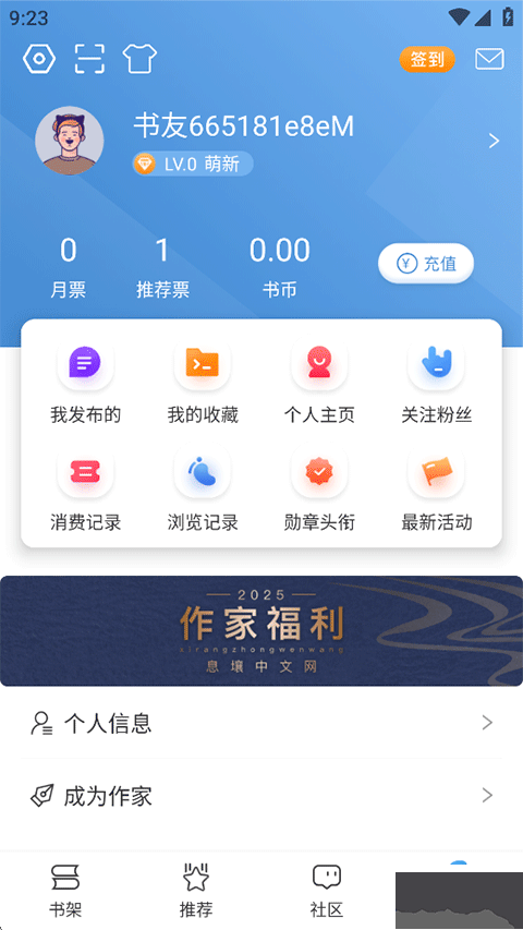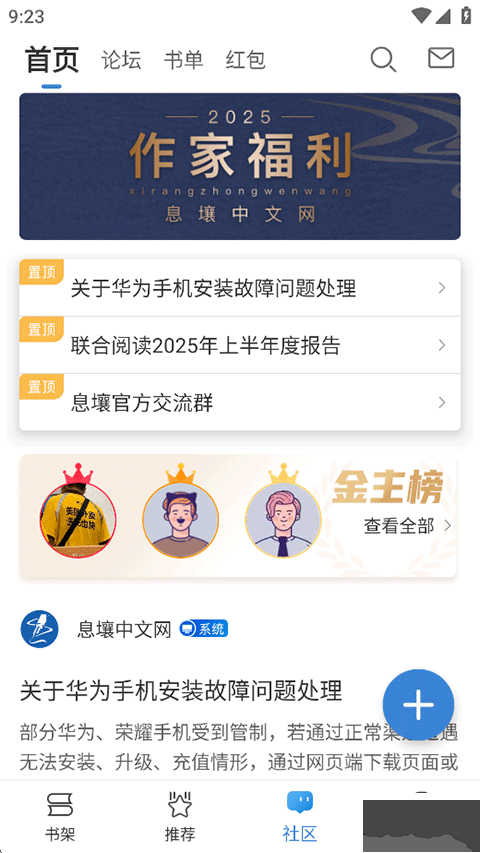 4、在社區(qū)模塊還能與書友、作者進(jìn)行溝通交流,點(diǎn)擊右側(cè)的+符號即可發(fā)布內(nèi)容;