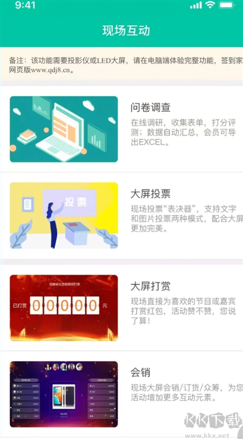 3、豐富互動(dòng)功能:內(nèi)置現(xiàn)場(chǎng)抽獎(jiǎng)、即時(shí)派獎(jiǎng)、動(dòng)態(tài)簽到墻等互動(dòng)模塊,助力活動(dòng)氛圍營(yíng)造,讓現(xiàn)場(chǎng)更生動(dòng)有趣。