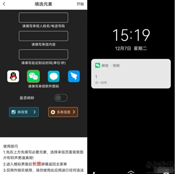 模擬消息:這是最實(shí)用的一個功能,選擇名稱、內(nèi)容、圖標(biāo)即可生成,還可以選擇背景以及多條信息。