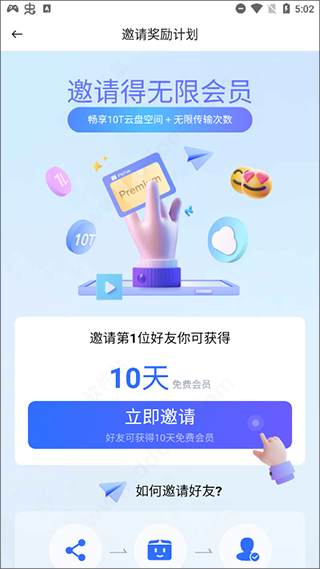 7、另外,如果你想要免費(fèi)享受pikpak會(huì)員服務(wù),還可邀請(qǐng)好友免費(fèi)領(lǐng)取