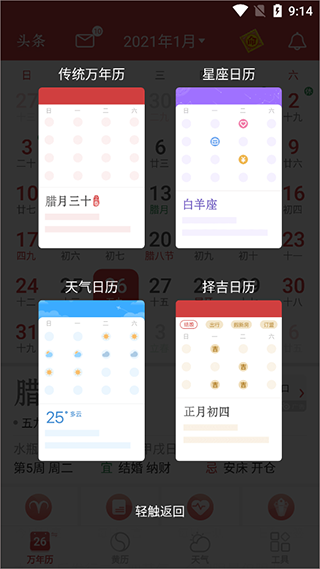 3、在點(diǎn)擊一次,將會(huì)回到主界面,點(diǎn)擊右側(cè)的黃歷,可以看到中國(guó)傳統(tǒng)黃歷;