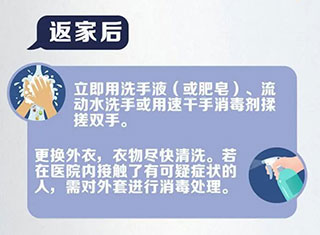 更換外衣,衣物盡快清洗。若在醫(yī)院內(nèi)接觸了有可疑癥狀的人,需對(duì)外套進(jìn)行消毒處理。