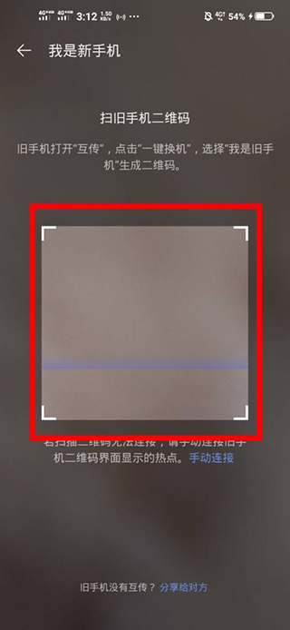 10、屏幕上會出現(xiàn)一個掃描框,將手機(jī)的攝像頭對準(zhǔn)上面舊手機(jī)屏幕上的二維碼進(jìn)行掃描,舊手機(jī)上面的數(shù)據(jù)就會一鍵轉(zhuǎn)移到新手機(jī)。