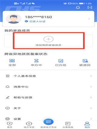 第一步:打開“國(guó)家醫(yī)保服務(wù)平臺(tái)”APP(中國(guó)醫(yī)療保障app),點(diǎn)擊底部菜單欄【我的】進(jìn)入個(gè)人中心頁面,在【我的家庭成員】版塊點(diǎn)擊圖標(biāo)“+”添加親情賬戶;