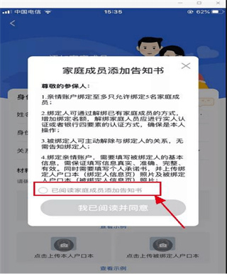 第二步:請(qǐng)仔細(xì)閱讀《家庭成員添加告知書》,確認(rèn)無誤后點(diǎn)擊【我已閱讀并同意】按鈕進(jìn)入家庭成員信息填寫頁面;