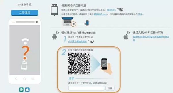 1、連接方式多樣:USB數(shù)據(jù)線、掃描二維碼或輸入驗證碼輕松實現(xiàn)手機與電腦連接