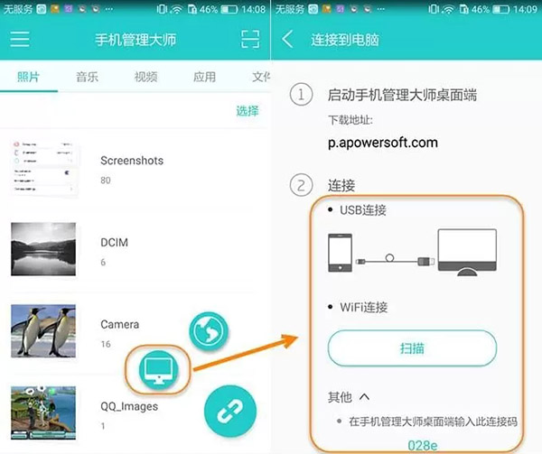 使用這種方式的前提是需要在電腦上安裝好Apowersoft手機管理大師桌面端,然后有以下三種方式連接手機和電腦。
