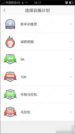 3、登錄進(jìn)咕咚的主界面后,我們會看到多種多樣的選項(xiàng),但是我們并不要著急地去點(diǎn)開它們,要一步一步地去設(shè)置才能更好的完成我們鍛煉的定制,首先我們來到“運(yùn)動”選項(xiàng)這里,劃到第二頁,進(jìn)行訓(xùn)練計(jì)劃的制定,一共有六種訓(xùn)練強(qiáng)度,分別是新手訓(xùn)練營、減肥燃脂等逐步遞增,我們需選擇適宜自身情況的情況進(jìn)行參與,并設(shè)定參與的時間。