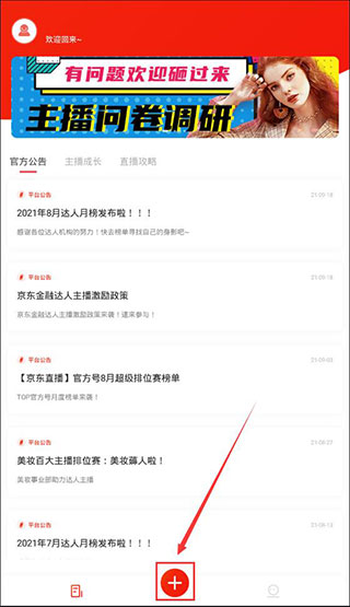 1、當(dāng)我們打開京東視頻app后,點(diǎn)擊軟件正下方的紅色加號(hào)。