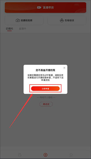3、此時(shí),軟件會(huì)提示我們不具備開播權(quán)限,我們?cè)冱c(diǎn)擊下方的立即申請(qǐng)按鈕。