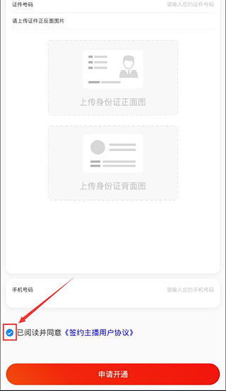 5、全部完善成功后,勾選下方的同意協(xié)議,然后點(diǎn)擊申請(qǐng)開通,就可以成功開直播了,如果您已經(jīng)具備了開播權(quán)限,就無需重復(fù)申請(qǐng)過程。