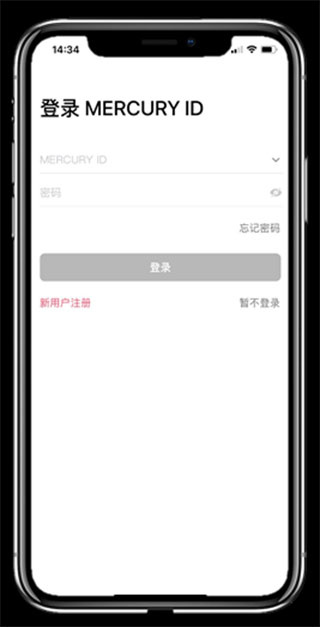 下載安裝水星安防app,打開MERCURY安防APP,輸入MERCURY ID的賬號和密碼,點擊 登錄。如果沒有MERCURY ID,請點擊 新用戶注冊,按照提示注冊MERCURY ID,如下圖: