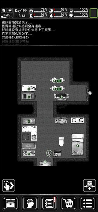 狀態(tài)欄:記錄你的身體狀態(tài)、溫度變化、發(fā)現(xiàn)的道具、戰(zhàn)斗結(jié)果及人物的動(dòng)作。六維過(guò)低時(shí)會(huì)有不同的提示。