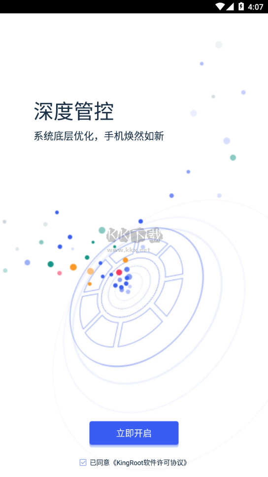 3、進(jìn)入Kingroot之后,點(diǎn)擊立即開啟,KingRoot會自動進(jìn)行Root并重啟手機(jī)