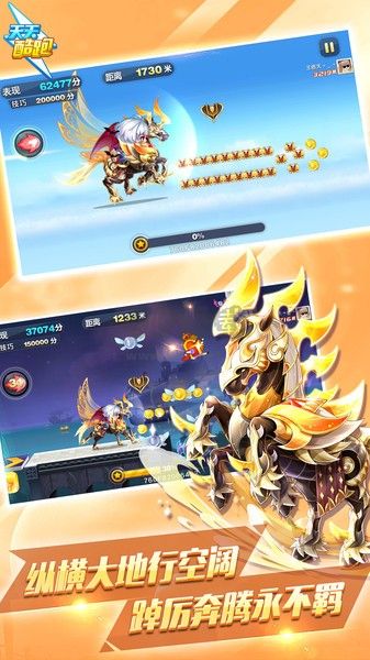 3.酷炫角色、超萌寵物。天天酷跑游戲中的三大主角各個都十分時尚炫酷,游戲中的三位主角均來自于槍神紀,除酷炫的角色外,還有閃靚的坐騎,萌動的寵物,整個游戲的畫面風(fēng)格都十分的清爽犀利,干凈利落的畫風(fēng)中透露著對于人物和場景的細膩刻畫,讓你的雙眼即使在超速的奔跑之中也不會感到疲憊。