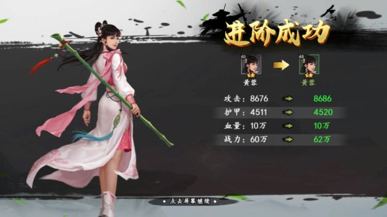單純進(jìn)階的對(duì)比,黃蓉從綠色品質(zhì)到達(dá)藍(lán)色品質(zhì)一共提升5w(62w-67w)想要快速進(jìn)階,最簡(jiǎn)單的辦法就是刷副本,通過(guò)前八章副本即可得到進(jìn)階所需的綠色俠客訓(xùn)練書(shū),如果不夠可以通過(guò)掃蕩換取俠客訓(xùn)練書(shū)。