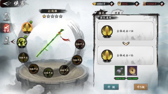 開(kāi)頭就講過(guò)很重要的一點(diǎn):俠客品質(zhì)及俠客等級(jí)是一切的基礎(chǔ),比如俠客的專武模塊,沒(méi)有等級(jí)做基礎(chǔ)(42級(jí)開(kāi)啟)是無(wú)法提升武器品質(zhì)的,在俠客的專武模塊中,不僅可以提升武將自身的屬性,還有幾處可以提升全體的屬性(如下圖黃蓉的打狗棒,隨等級(jí)開(kāi)啟更多的強(qiáng)化選項(xiàng),每個(gè)選項(xiàng)強(qiáng)化的項(xiàng)目也都不同),對(duì)單個(gè)俠客以及整支隊(duì)伍都有著極高的加成,但這一切的基礎(chǔ)就是玩家等級(jí)以及俠客等級(jí)。
