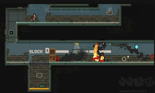 地上有紅色的點,類似于延遲地雷,觸碰之后過幾秒會爆炸,然后頂壞鐵障礙跳上去,將鐵頂壞之后接著頂黃色的機關,掉落炸彈從而讓右邊的墻壁崩塌,這樣就可以再次拿到綠色背包的武器。