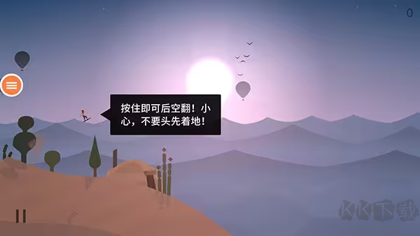 5、經(jīng)過大坡,我們可以按住右邊屏幕進(jìn)行后空翻,獲取更高的分?jǐn)?shù),注意不要頭先著地,