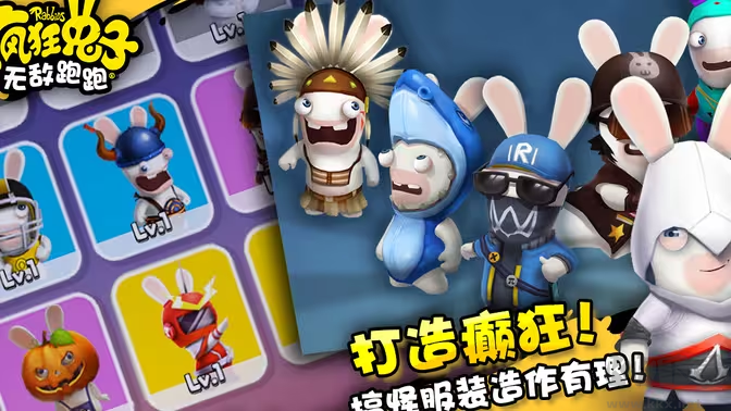 《瘋狂兔子:無敵跑跑》是一款由Ubisoft開發(fā)的融合了《瘋狂兔子》系列世界觀的競(jìng)速跑酷游戲。玩家在游戲中需要操控瘋兔在不同的環(huán)境之下四處奔跑,在游戲之中收集飲料罐和金幣。玩家在游戲中要完成多個(gè)不同的任務(wù),一次來增加自己獲得的金幣數(shù)料。玩家可以在游戲中解鎖不同的瘋兔造型,以此來打造自己的專屬的瘋兔,警察、忍者、棒球運(yùn)動(dòng)員、救火隊(duì)員等一應(yīng)俱全,甚至《刺客信條》系列都出現(xiàn)在了本作之中。游戲的目標(biāo)與系列保持一致——回到月球。