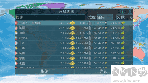2、Dummynation的地圖采用真實世界地圖,包括亞洲、非洲、歐洲、美洲等多個大洲,玩家可以自由選擇國家,開啟全球爭霸之旅。