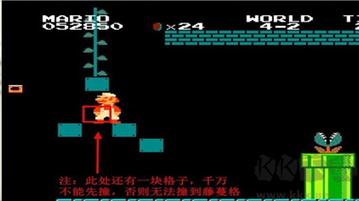 4、先撞下面的方塊,再撞出藤蔓方塊,爬上藤蔓。(注:藤蔓方塊下方還有一個(gè)方塊,千萬(wàn)不能先撞,否則無(wú)法撞出藤蔓)