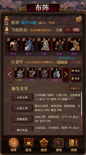 進攻周邊城池(盟友城池除外),合理搭配出征武將是關鍵,很多武將都有組合效果提升屬性或效果,可以大大提升戰(zhàn)斗效果。