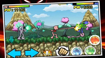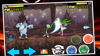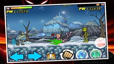 來看看這個游戲的操作到底是什么樣的。左邊的三個按鈕分別是火柴人的前進與后退,還有一個控制火柴人俯身,躲避敵人的攻擊。右邊有三個帶顏色的按鈕,藍色的控制火柴人腿上的攻擊,綠色的控制火柴人的手上攻擊,紅色的則是控制跳躍。然后還存在一個暴擊符號,這個可以讓火柴人的攻擊值增大,給敵人帶來大的傷害,不過輸出時間有限,需要一定時間恢復。而且一旦我們存到了足夠的金幣,我們還可以購買槍支,這樣就可以輕松的解決敵人(注意節(jié)約子彈的使用哦)。