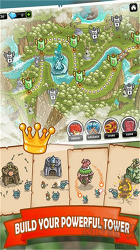 2、建筑:游戲中有4基本建筑:箭塔、法師塔、兵營和火炮塔。每種建筑都可以進(jìn)行升級,當(dāng)升到第四級時,出現(xiàn)轉(zhuǎn)職選項,可以二選一。升級到高級建筑后,還可以配備2至3種專屬技能。