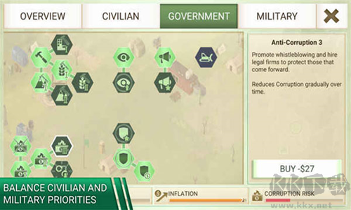 在對(duì)區(qū)域進(jìn)行修整和發(fā)展的同時(shí)還要時(shí)刻的防范叛軍篡奪權(quán)力的圖謀。當(dāng)然,這片建設(shè)的道路并不是那么的平坦,期間玩家會(huì)遇到各種問題,各種通貨膨脹、政府腐敗、國際輿論等問題,你做好準(zhǔn)備來阻止這場(chǎng)叛亂了嗎?