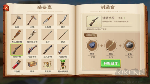 5、荒島狩獵極其危險,請制造對抗野獸及怪物的武器,以此確保在海上生存下去。