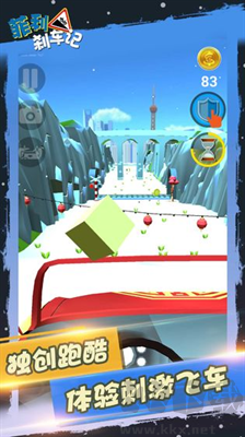 4、還需通過巧妙的下山線路,拾取一路上隨機(jī)散布的金幣,從而不斷將其累積,購買解鎖出更多可控制的帥氣轎車。