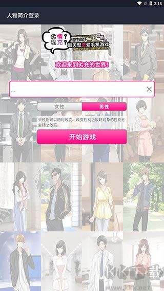 1、進(jìn)入劣充中文版游戲之后,我們需要先填寫(xiě)角色昵稱,再選擇性別,型別不同,游戲中可攻略的角色也不同。