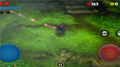 這款游戲采用3D雙搖桿操作,左下角的虛擬搖桿控制角色移動,右下角的F按鈕是攻擊鍵,游戲支持自動瞄準,你只需控制怪物,按住F按鈕不停攻擊即可,操作十分簡單。