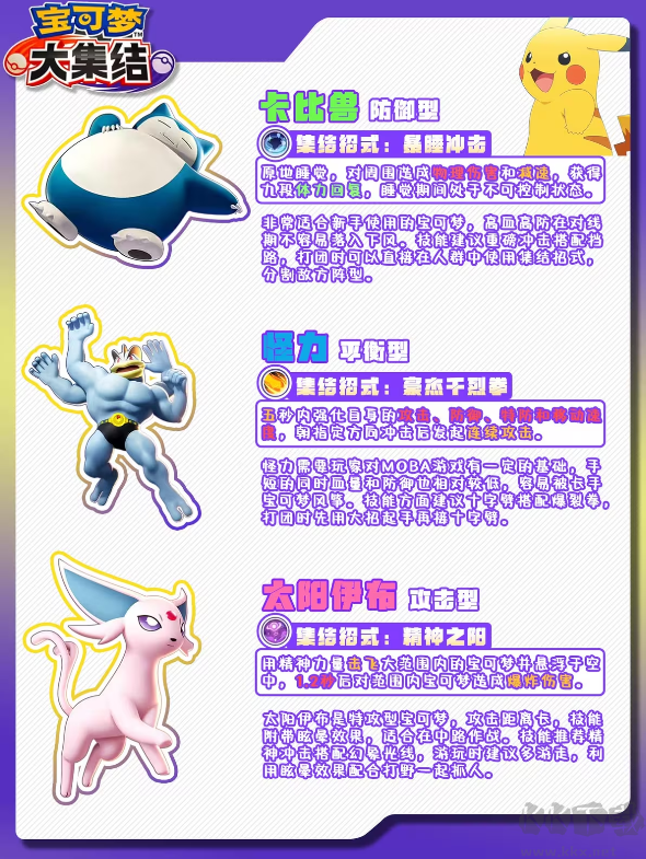 皮卡丘:萌新的神選、靈活機(jī)動(dòng)、火力全開(kāi)。游戲的風(fēng)格是適合長(zhǎng)距離的對(duì)敵人進(jìn)行騷擾,但是血少。