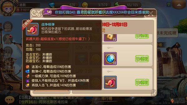 最后說(shuō)一下大招,由于這里的力度和距離都是玩家手動(dòng)操控的,不像彈彈堂有公式可以看,稍微遠(yuǎn)一點(diǎn)就全看手感了,所以在這里要做到彈彈堂的3線合一(散彈)或者TNT的9點(diǎn)合一(大招)是十分困難的,所以還是超級(jí)連發(fā)比較好用,競(jìng)技刷副本也不沖突。