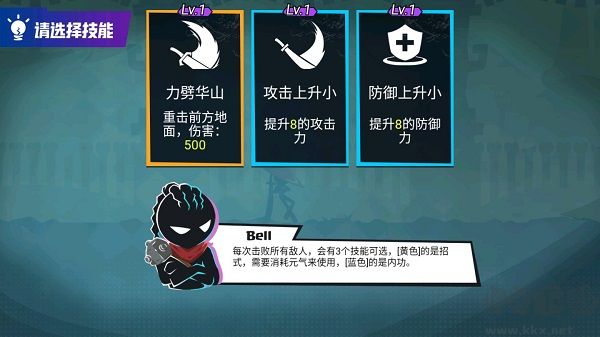 3、然后在每次擊敗所有敵人,會(huì)有三種技能選擇,【黃色】是招式,需要消耗元?dú)馐褂?,【藍(lán)色】是內(nèi)功。