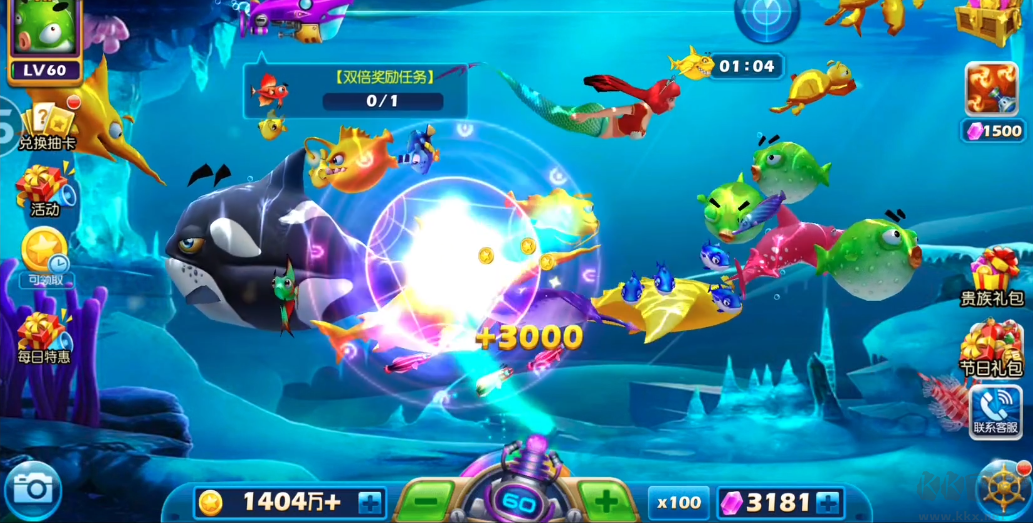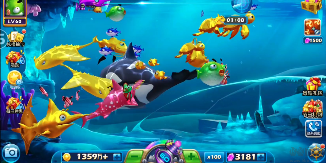 憑借金幣,你可購(gòu)入各類(lèi)實(shí)用道具。比如強(qiáng)力炸彈,瞬間便能對(duì)一片區(qū)域內(nèi)的魚(yú)類(lèi)造成巨額傷害;還有能短暫凍結(jié)魚(yú)類(lèi)行動(dòng)的冰凍道具,讓你在捕捉目標(biāo)魚(yú)時(shí)更加得心應(yīng)手。這些道具能大幅提升捕魚(yú)效率,有效增加爆率。