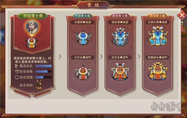 中級、高級、頂級箭塔分別在武將等級:10級、30級、45級時(shí)可以開啟晉級。顧名思義,級別越高,攻擊傷害和攻擊范圍也會隨之上漲。(主公請努力的戰(zhàn)斗升級吧!