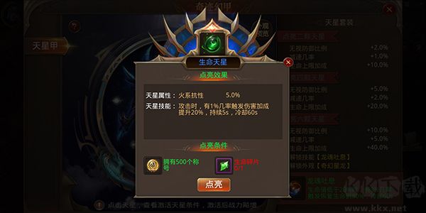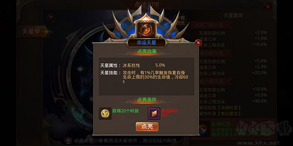 六顆天星全部點亮解鎖炫酷的外觀【奇幻星龍】,和強大的技能【龍魂吐息】,龍魂吐息技能:生命值低于20%時,有3%幾率觸發(fā)恢復生命到80%,技能冷卻時間為60秒。