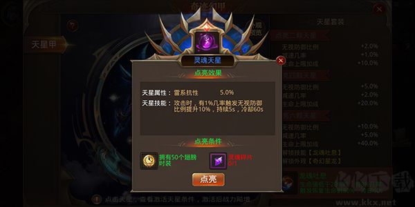天星技能:攻擊時,有1%的幾率觸發(fā)無視防御比例提升10%,持續(xù)5秒,冷卻時間為60秒。