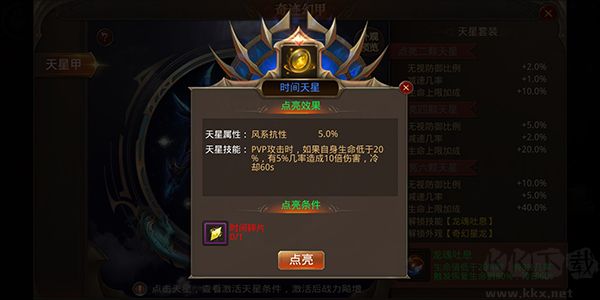 天星技能:PVP攻擊時如果自身生命低于20%,有5%幾率造成10倍傷害,技能冷卻時間為60秒。